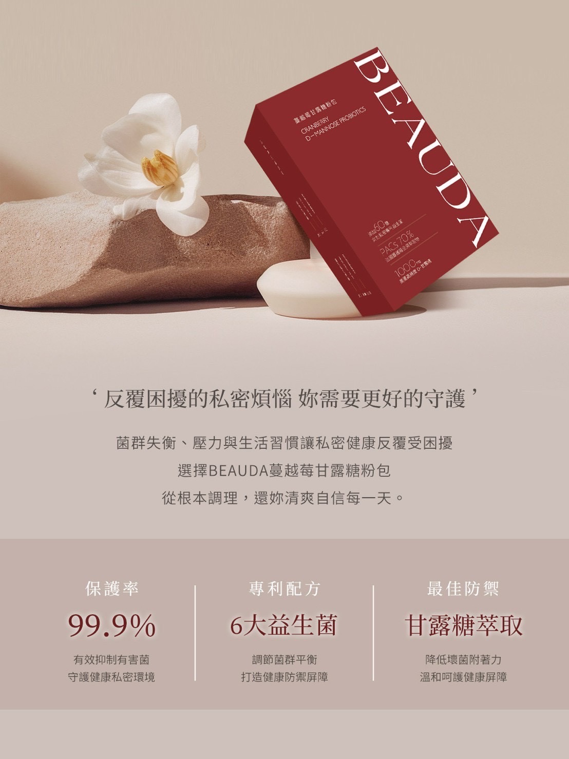 菌群失衡、壓力與生活習慣讓私密健康反覆受因擾。選擇 BEAUDA 蔓越莓甘露糖益生菌粉包,從根本調理,還妳清爽自信每一天。